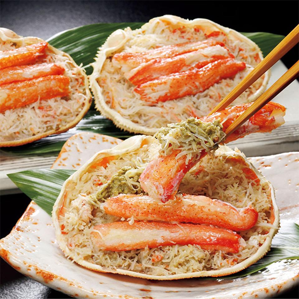 北海道産のおおずわいがにをゆで上げ、殻をむき、丁寧に身をほぐし、味噌と一緒に甲羅盛にしました。