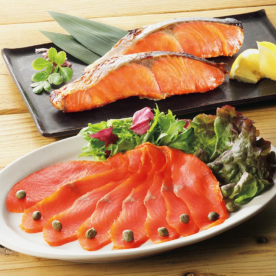 MSC認証の紅鮭を使用し、甘塩味の切身と、北海道産の広葉樹でじっくりと燻製したスモークサーモンを詰合せました。