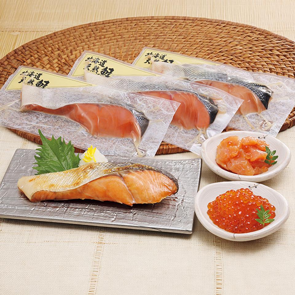 北海道鮭塩切身80g×4、鮭ルイベ漬・いくら醤油漬 各60g