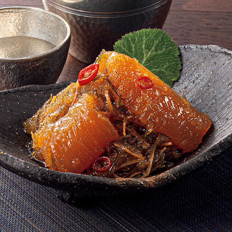 柔らかい数の子を使って、スルメや昆布と漬け込んで仕上げた松前漬です。数の子は食べやすいサイズの「折れ子」を使っております。