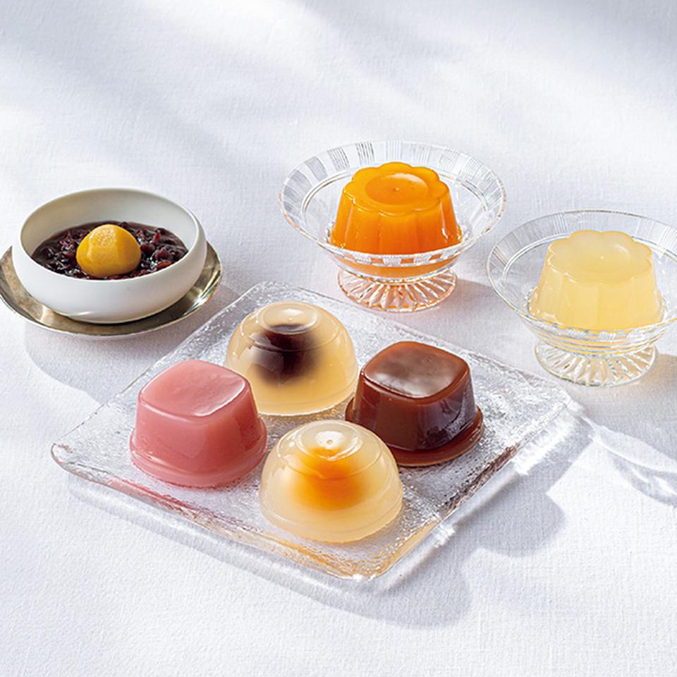 葛よせ(あずき95g×2、梅・金柑・抹茶 各95g)、フルーツゼリー(白桃・マンゴー・かぼす 各91g×2)、水ようかん(こし・柚子・赤しそ 各82g×2)、栗ぜんざい70g×3