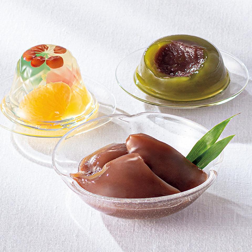 吉野本葛を活かした「葛水ようかん」、甘夏ぜりぃ「みつまめ」、こし餡を抹茶わらび餅で包んだ「抹茶わらび餅」を詰合せた夏の贈り物です。