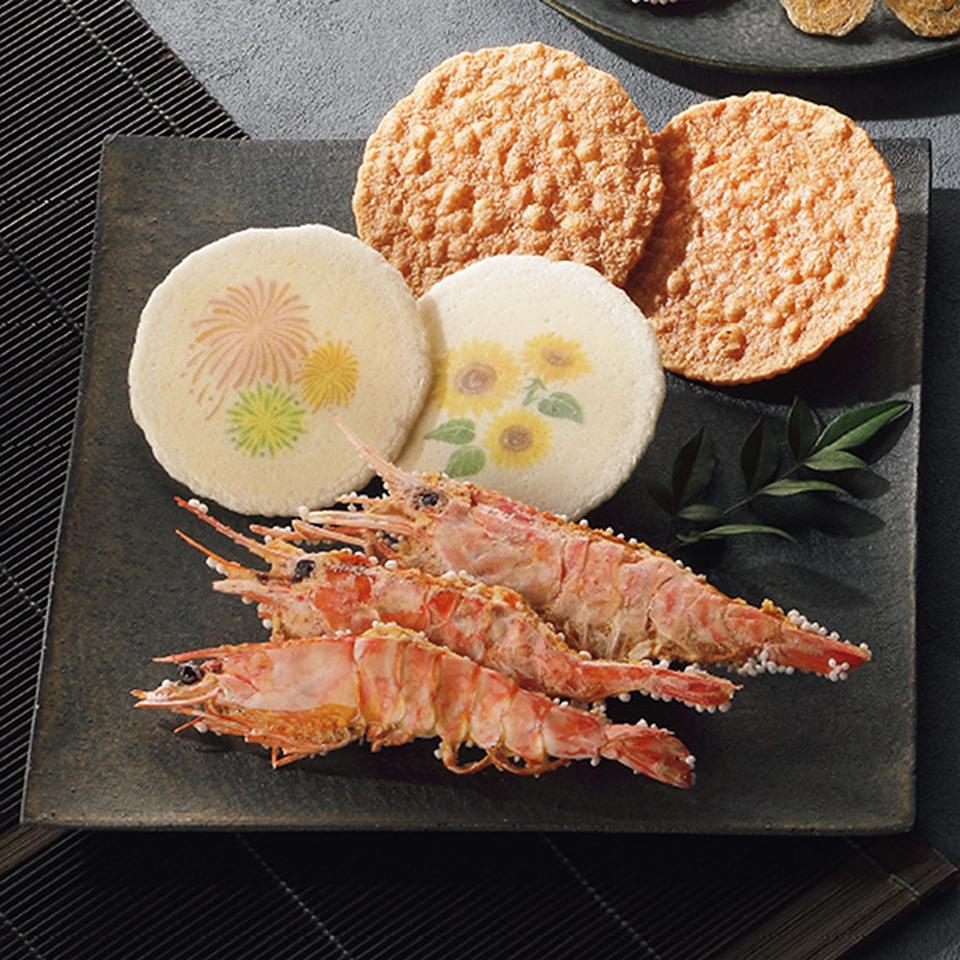 国産車えび、北海道産甘えびの姿形を活かして焼き上げた「姿焼き」、夏の風物詩を描いたえびせんべいの詰合せです。