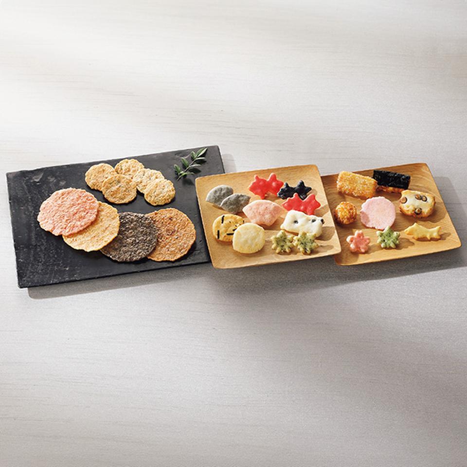 海老、帆立、いか、たこ。素材の旨みや風味をとじ込めた海鮮せんべいと、国産米を100%使用したひと口米菓、夏の風情を味わうふきよせなどさまざまなお味が楽しめる詰合せです。