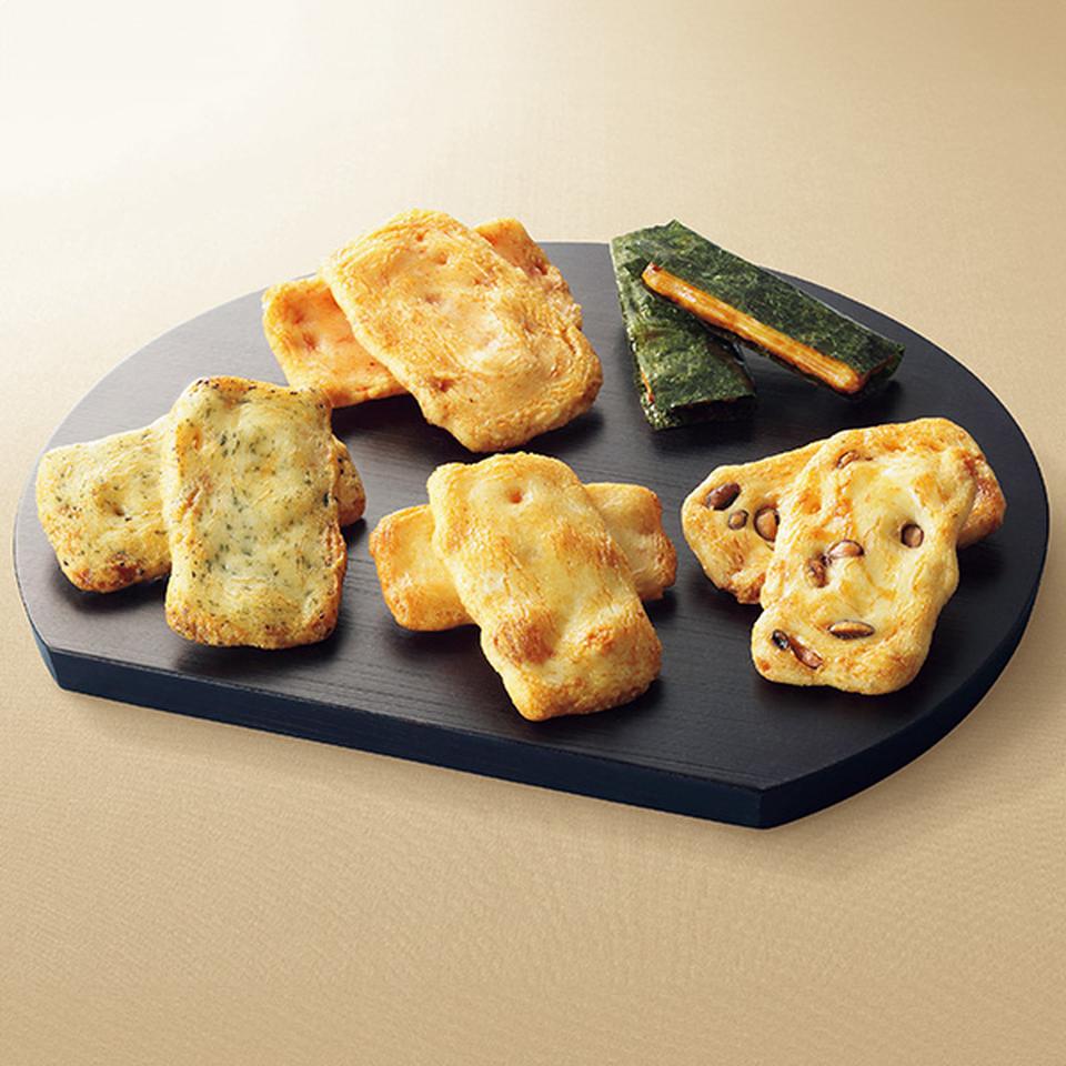 国産もち米を使用し、パリッとした食感に焼き上げたおかき、5種類の味の詰合せ。