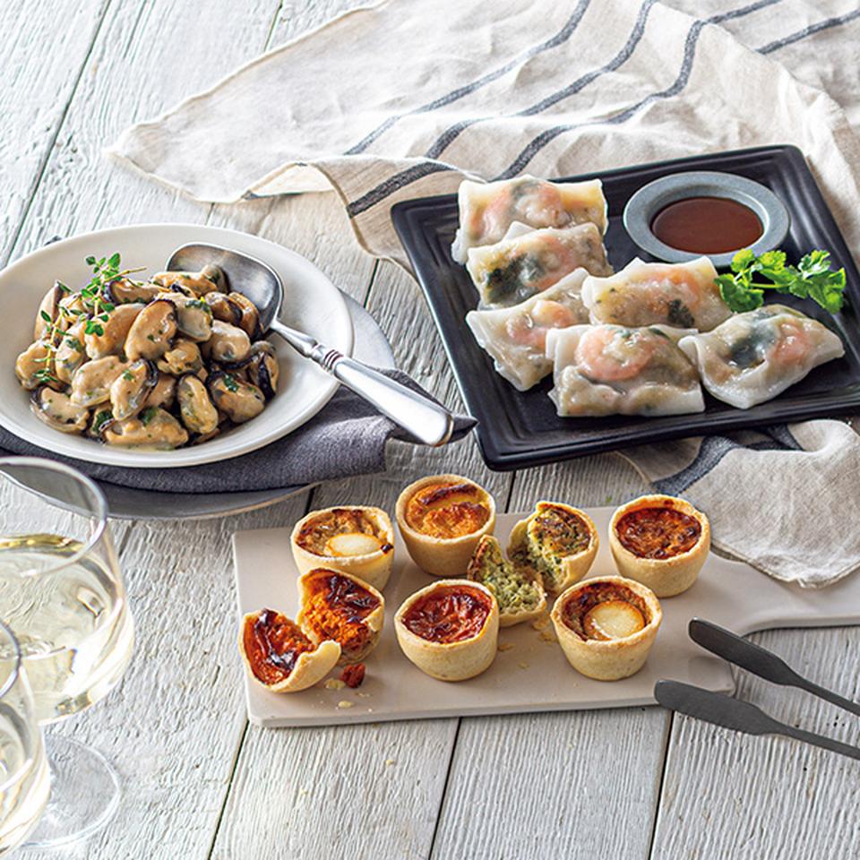 手軽に食べられるミニキッシュ、エビの蒸し春巻き、味付きのムール貝の詰合せです。