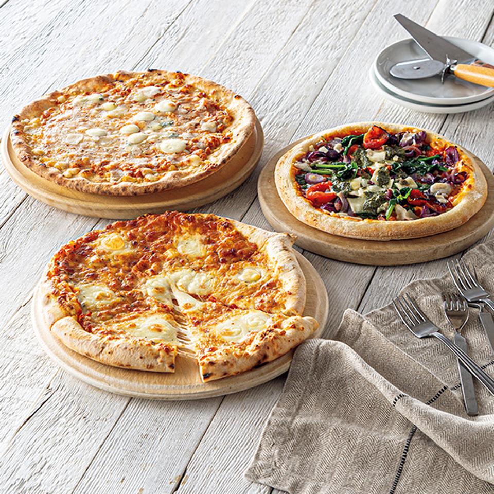 ピッツァマルゲリータ420g(直径28cm)、野菜 ペストソース パルミジャーノ・レッジャーノのピッツァ400g(直径24cm)、クワトロフォルマッジ390g(直径27cm)
