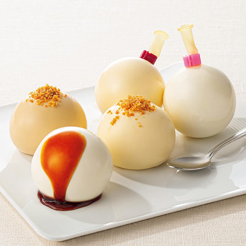 カラメルソースやカラメルクラッシュをかけて楽しむ風船に入ったプリンです。