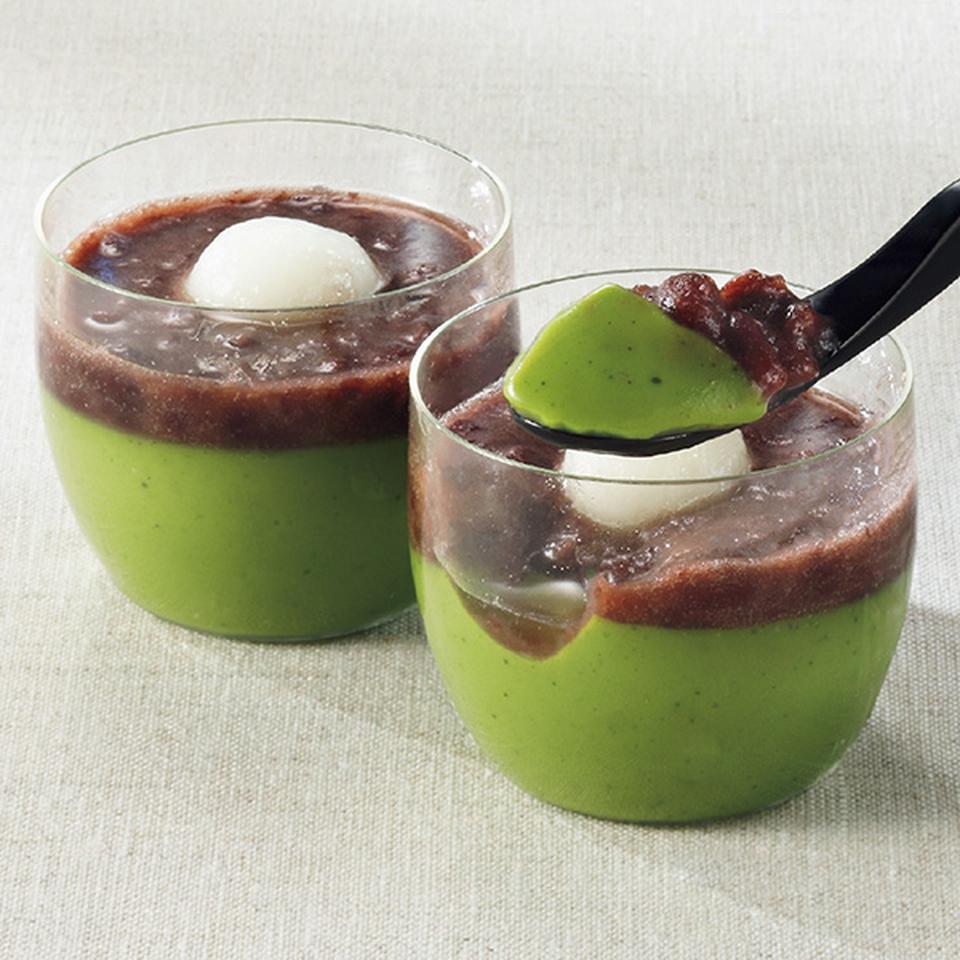十勝橋本牧場の生乳を使った抹茶プリン。十勝産小豆の粒餡と白玉入り。