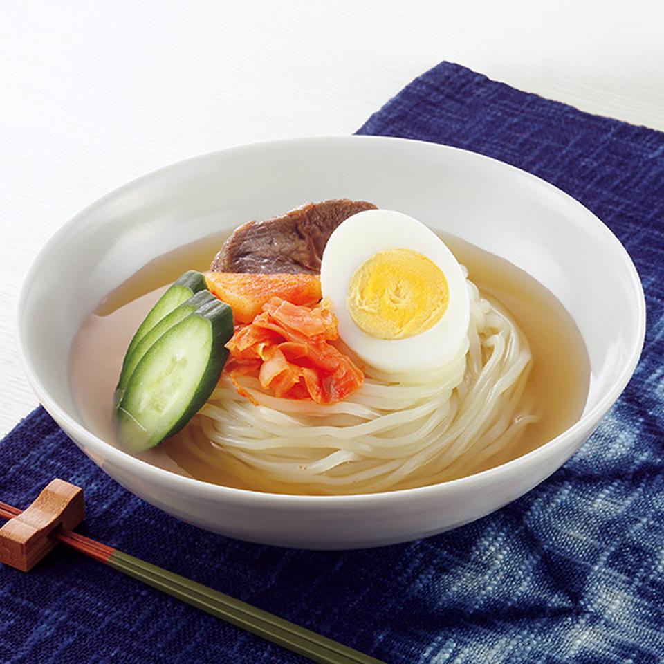 コシの強い生麺と、コク深いあっさりスープが好相性。キムチ・牛味付肉・ゆで卵もセットで。