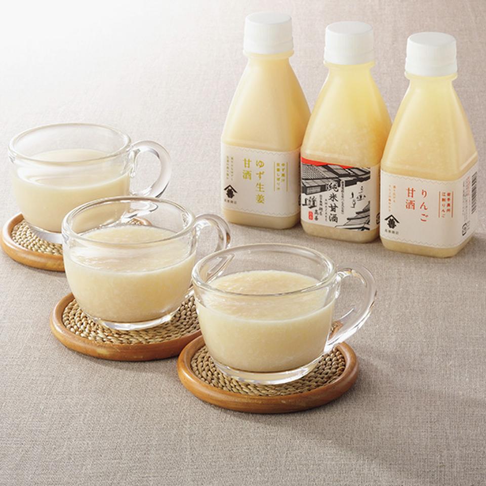 岩手県産餅米と米麹でつくった昔ながらの甘酒。りんご、ゆず生姜との3種セットです。