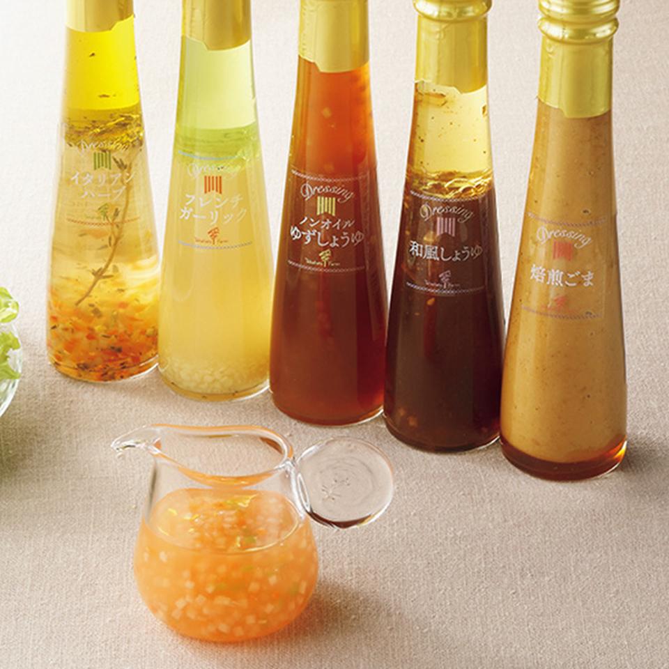 ドレッシング(イタリアンハーブ・フレンチガーリック・ノンオイルゆずしょうゆ・ノンオイル大根と人参・和風しょうゆ・焙煎ごま)各122ml