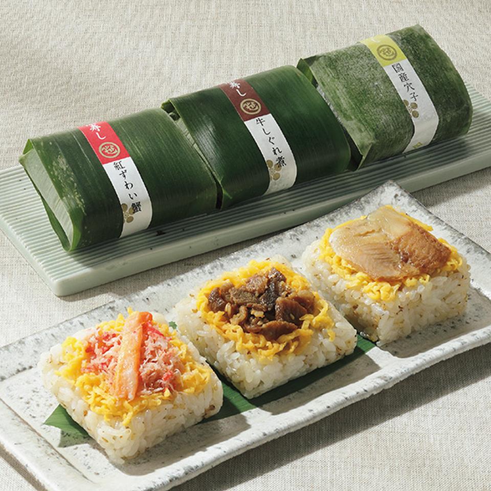 3種の具材を笹の葉でくるんだ、レンジで温めるお寿司です。