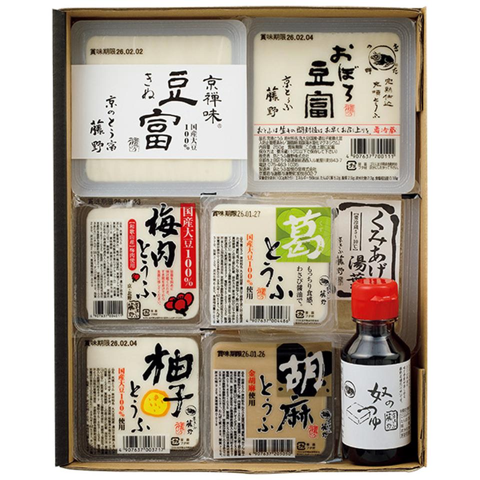 京禅味きぬ豆富300g、おぼろ豆富250g、柚子とうふ150g、葛とうふ120g、梅肉とうふ150g、胡麻とうふ120g、くみあげ湯葉80g、奴のつゆ100ml