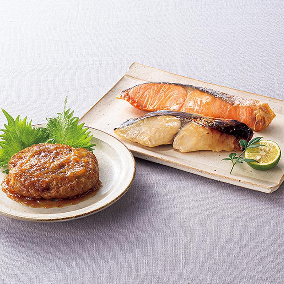 純黒煮込みハンバーグ(デミグラスソース150g×2、和風おろしソース150g×2)、さわら西京焼65g×2、銀鮭西京焼90g×2