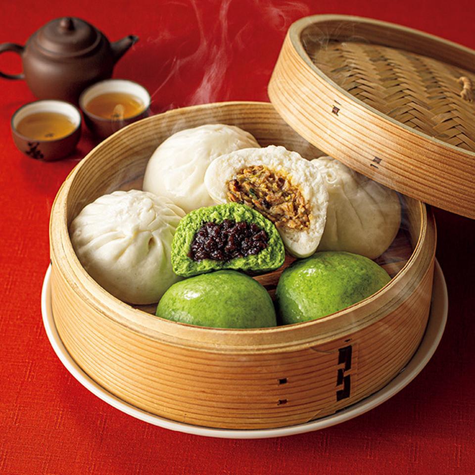 豚肉、キャベツ、筍に椎茸を加えて仕上げた具材の肉まんと皮に抹茶ペーストを練り込みあんことのハーモニーを楽しめるあんまんの詰合せです。