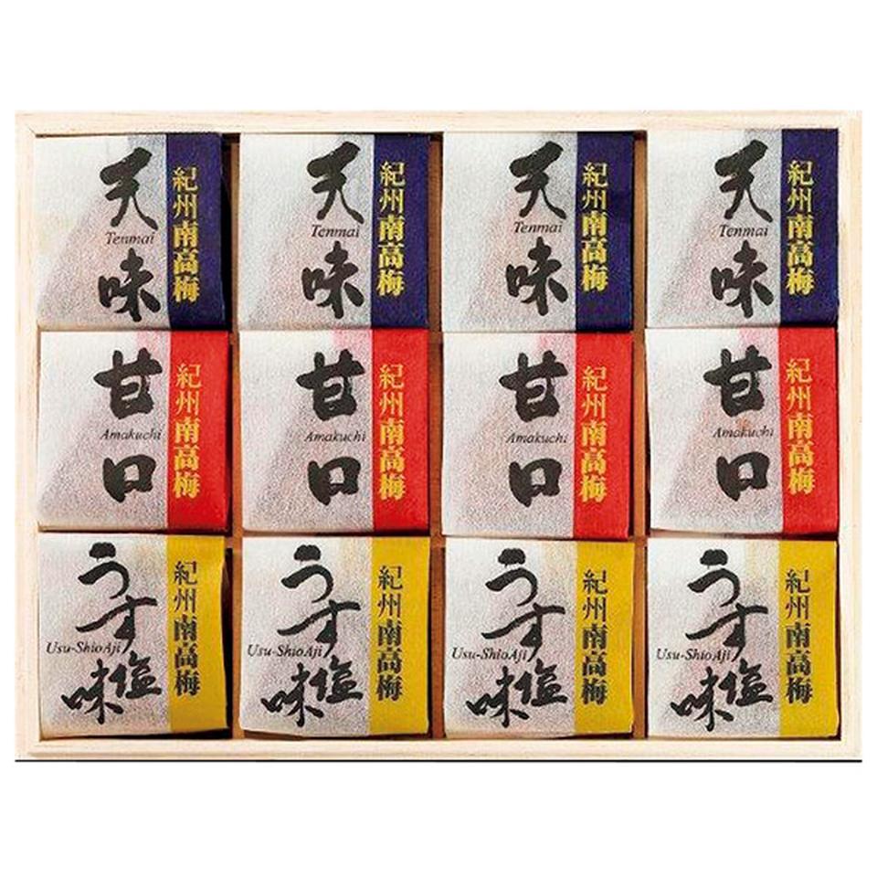 甘口はちみつ(塩分約6%)、うす塩味天味(塩分約4%)、うす塩味梅干(塩分約6%)(各原料梅和歌山県産A、B等級、各3~4Lサイズ)計240g