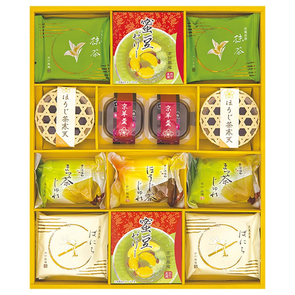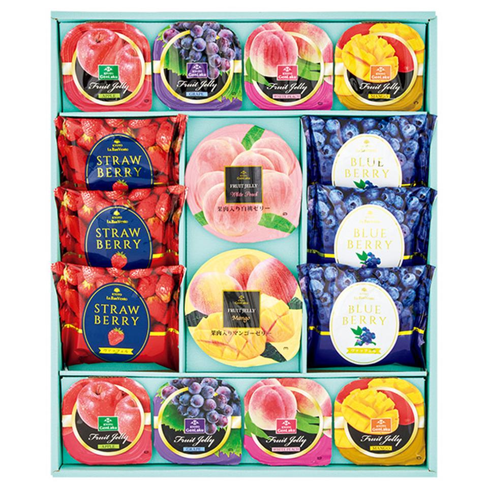 ゼリー(アップル・ピーチ・グレープ・マンゴー)各62g×2、果肉入りゼリー(白桃・マンゴー)各110g、ヴァッフェル(ストロベリー・ブルーベリー)各3、ほうじ茶寒天72g×2、京羊羹64g×2、洋風煎餅(ばにら・抹茶)各2枚入×4、蜜豆ゼリー110g×2、じゅれ(まっ茶2・ほうじ茶)各70g