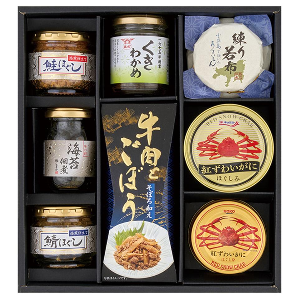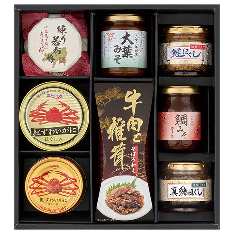 キョクヨー紅ずわいがにほぐしみ90g×2、宝幸紅ずわいがにほぐし身55g×2、牛肉とごぼうのそぼろ和え55g、牛肉と椎茸のそぼろ和え55g、酒悦(大葉みそ115g、くきわかめ80g)、磯じまん(鯛みそ100g、海苔佃煮90g)、練り若布80g、練り若布梅80g、鯖ほぐし40g、真鯵ほぐし40g、鮭ほぐし40g×2