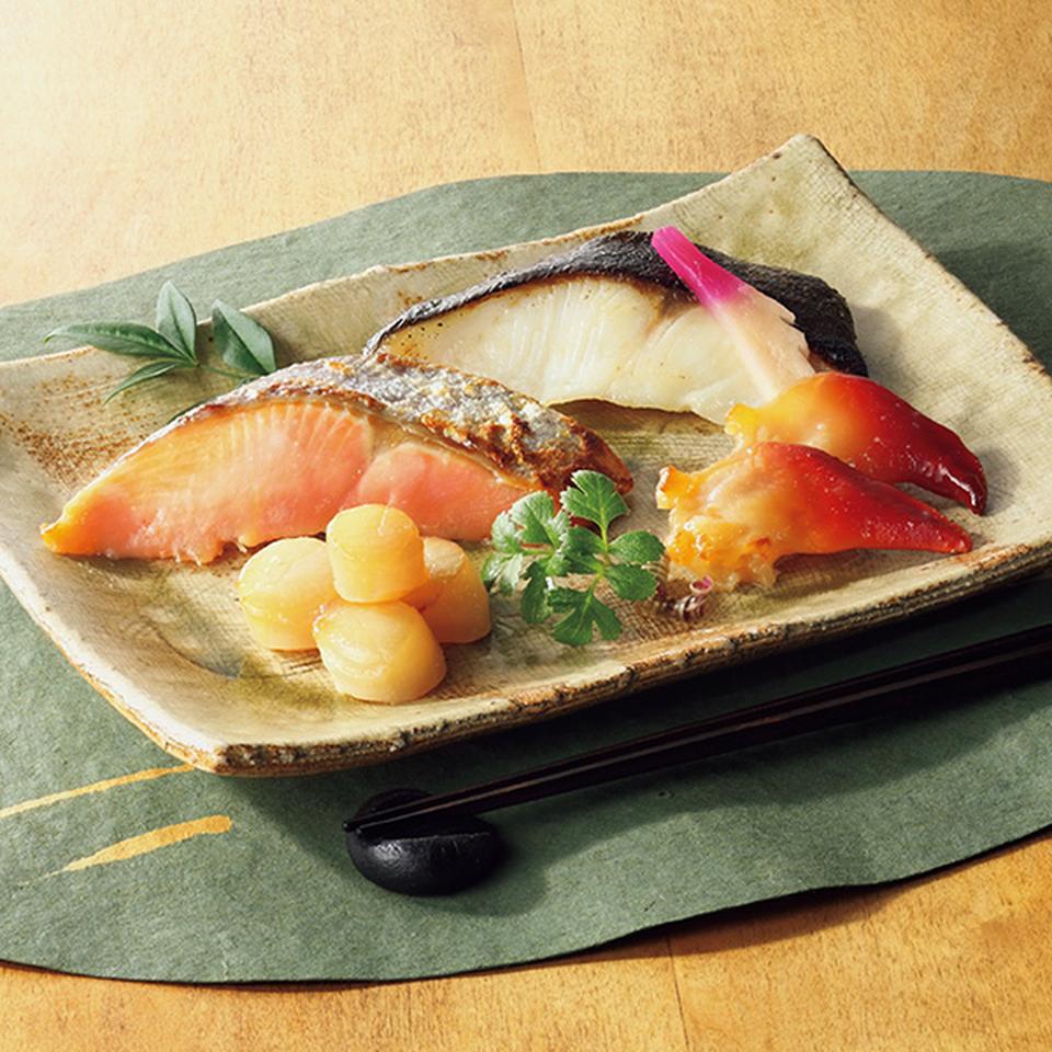 名店のコースにも取り入れられる西京漬。お酒にも合う北寄貝と帆立、ご飯がすすむ鮭と銀鱈をセットに。