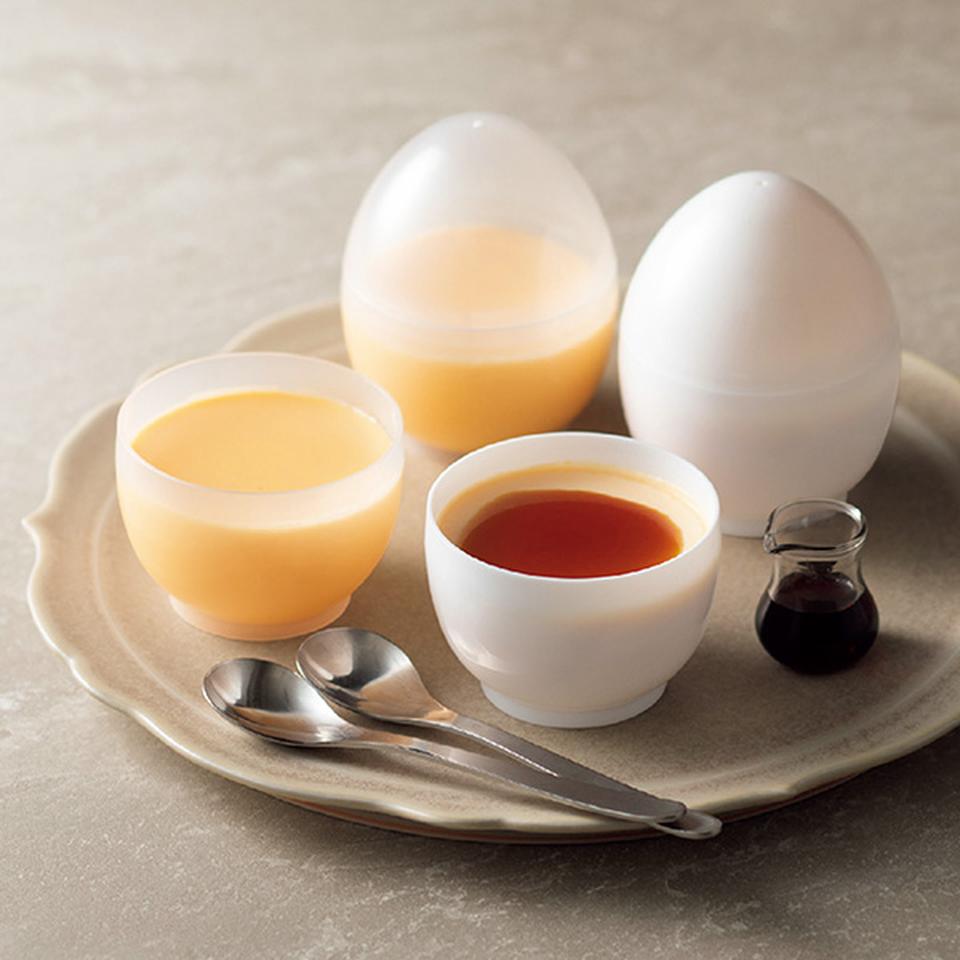 コクと甘みがある卵を使用した「たまごプリン」と生クリームを混ぜた「なめらかプリン」をセットに。