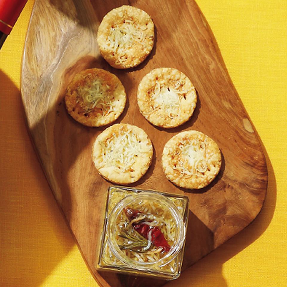 サクッと香ばしいしらすチーズパイに、焦がしニンニクが香るしらすアヒージョをのせてご褒美おつまみの完成!