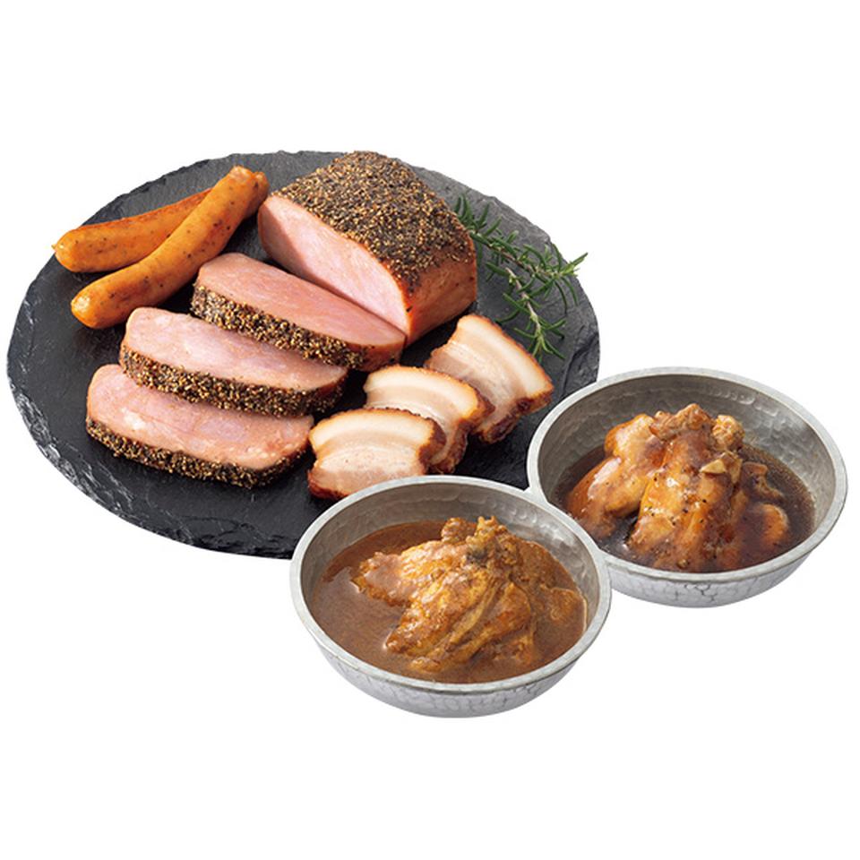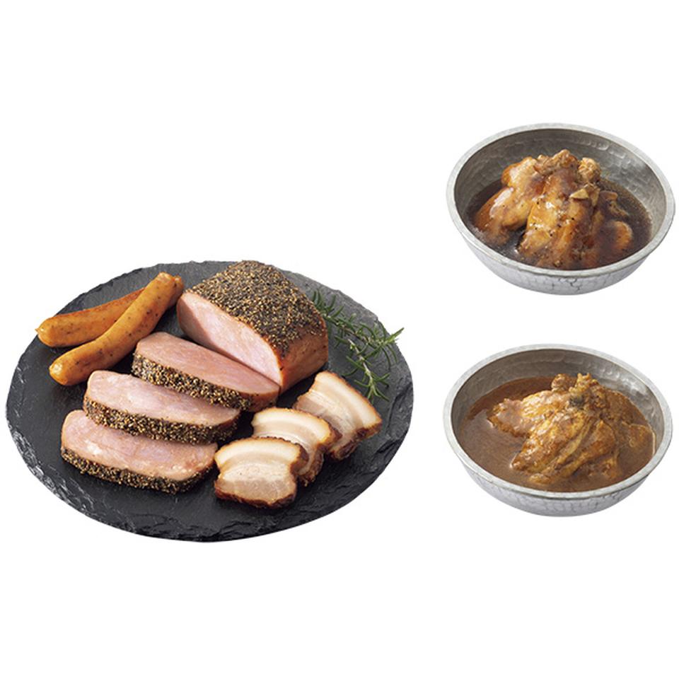 グリーンペッパーウインナー100g、スパイシーペッパーポーク310g、ルーロー風つるし焼豚170g、チキンバックリブスパイスカレー煮210g、チキンバックリブペッパー醤油煮180g