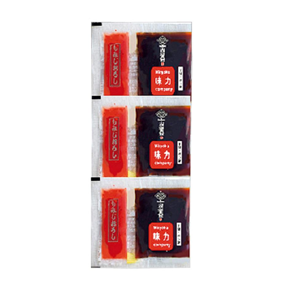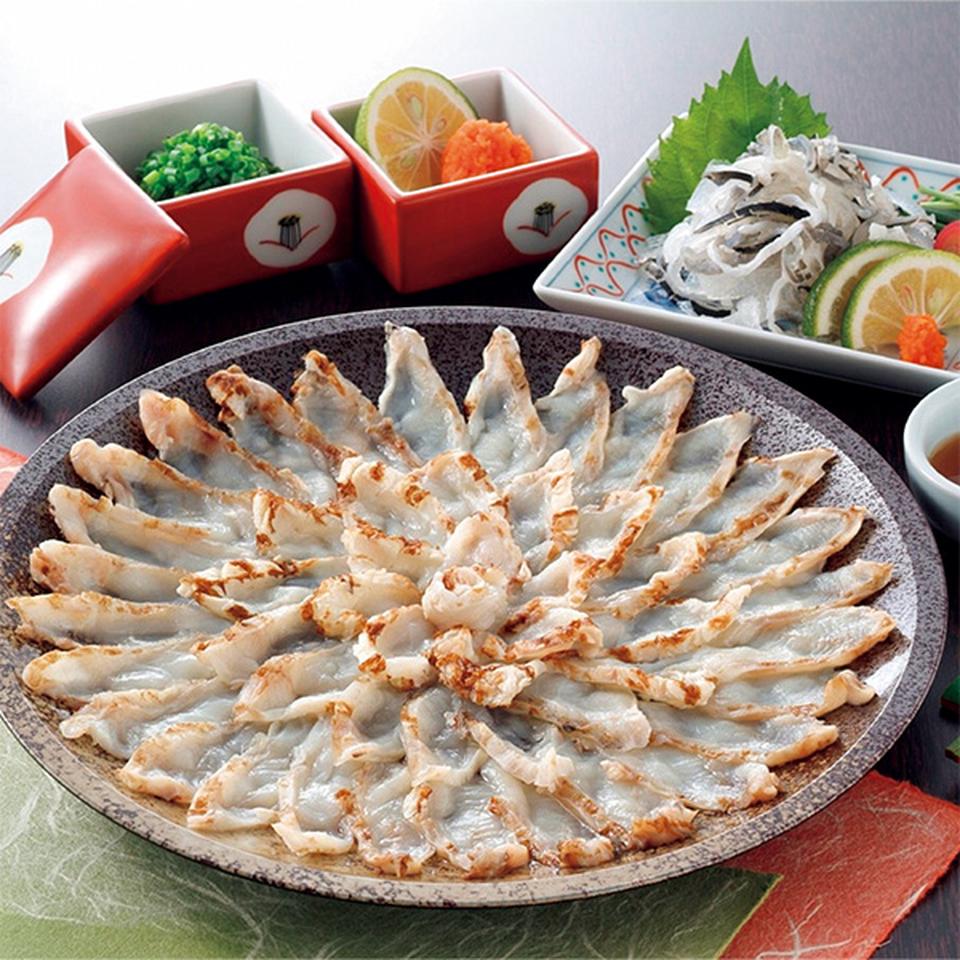 ふぐたたき(真ふぐ又はごまふぐ)150g、とらふぐ皮60g、ポン酢14g×3、もみじおろし2.5g×3