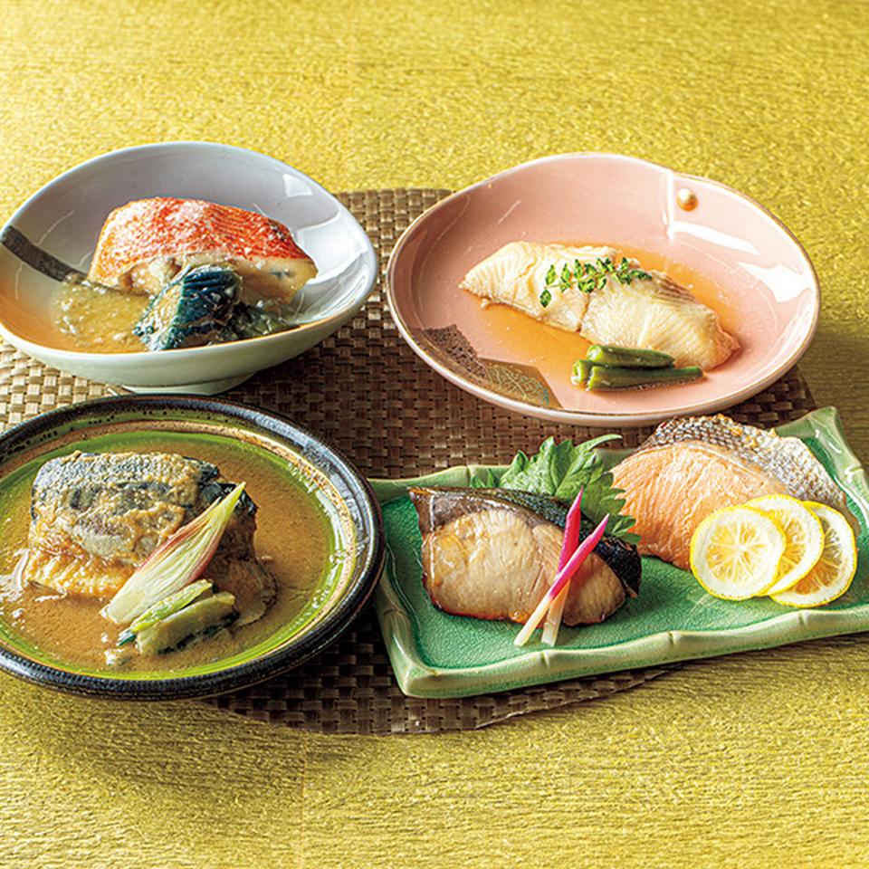 銀鮭塩麹焼・カラスガレイ煮付 各50g、ぶり照焼・赤魚和風あんかけ・さば味噌煮 各50g×2 計8