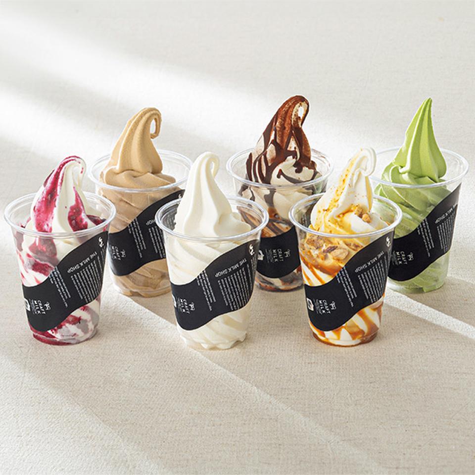 ソフトサーブ(ミルク、ラテ、キャラメルナッツ、ミックスベリー、揖斐抹茶、チョコ)