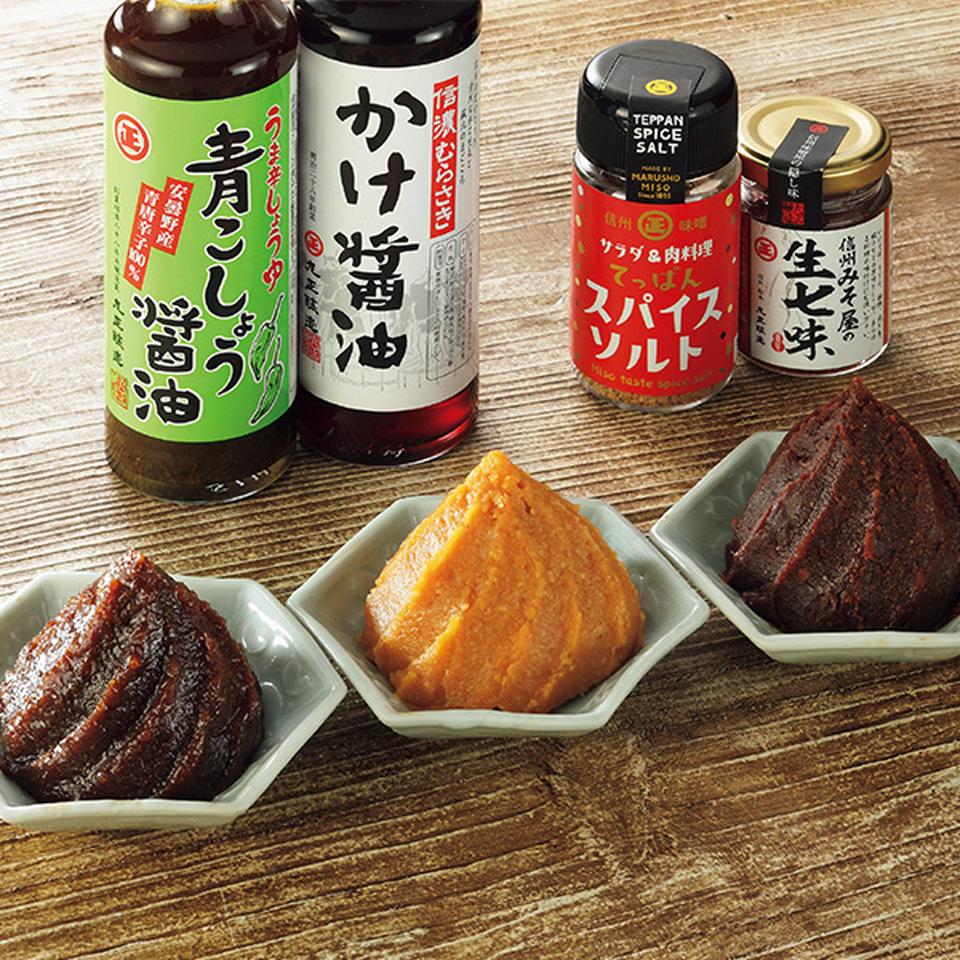 青こしょう醤油200ml、かけ醤油200ml、蔵出し味噌300g、二年味噌300g、ごまくるみ味噌180g、生七味55g、スパイスソルト75g