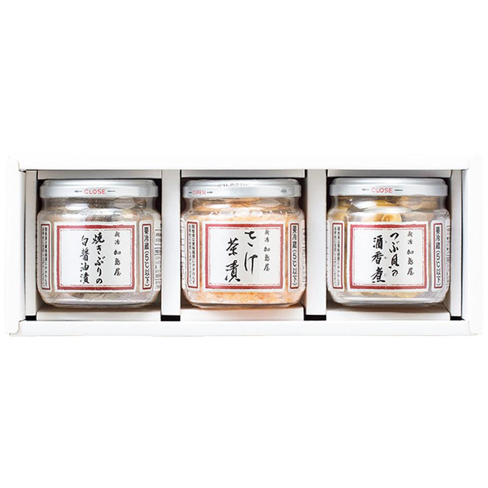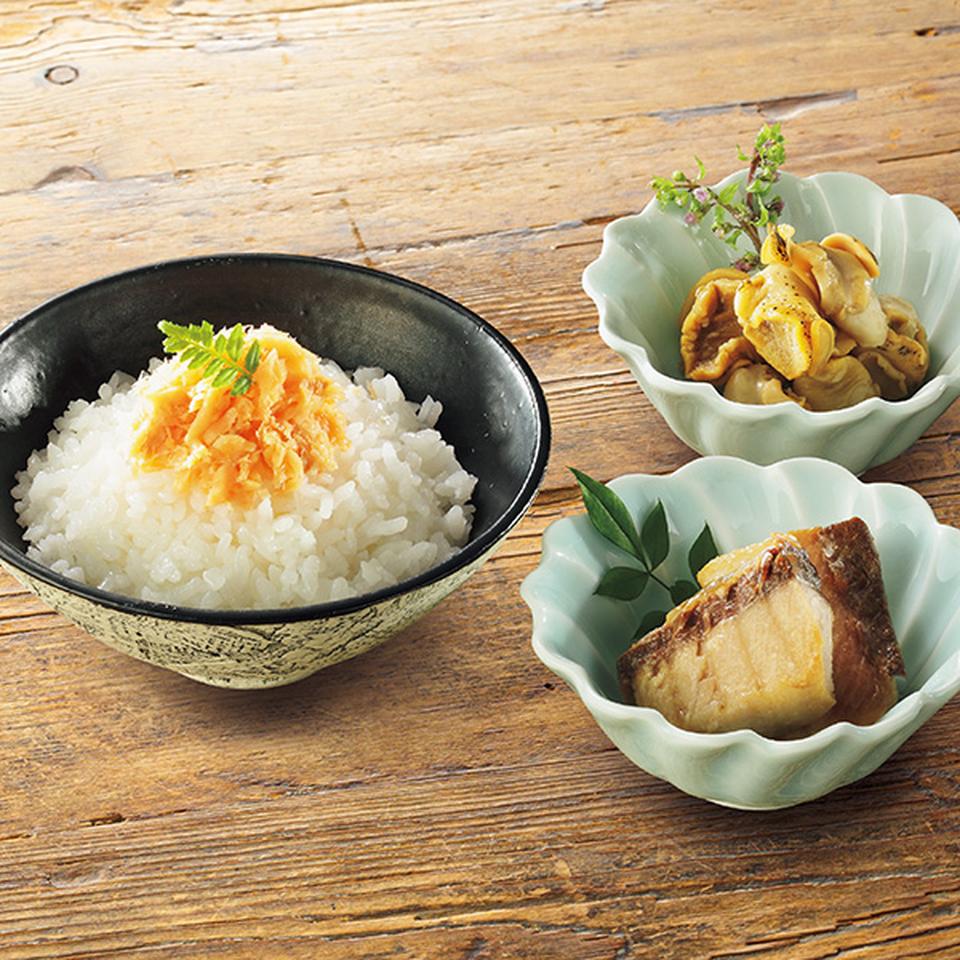 さけ茶漬130g、焼きぶりの白醤油漬100g、つぶ貝の酒香煮90g