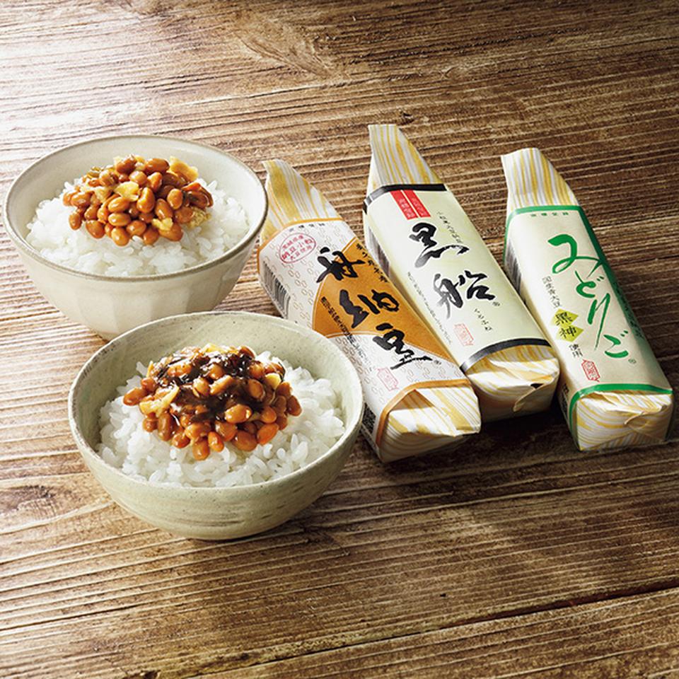 舟納豆・もち麦入り舟納豆・黒船・みどりご・青仁一粒・黒粒納豆 各80g、こごいら納豆焼きあご味・こごいら納豆梅アカモク味 各100g