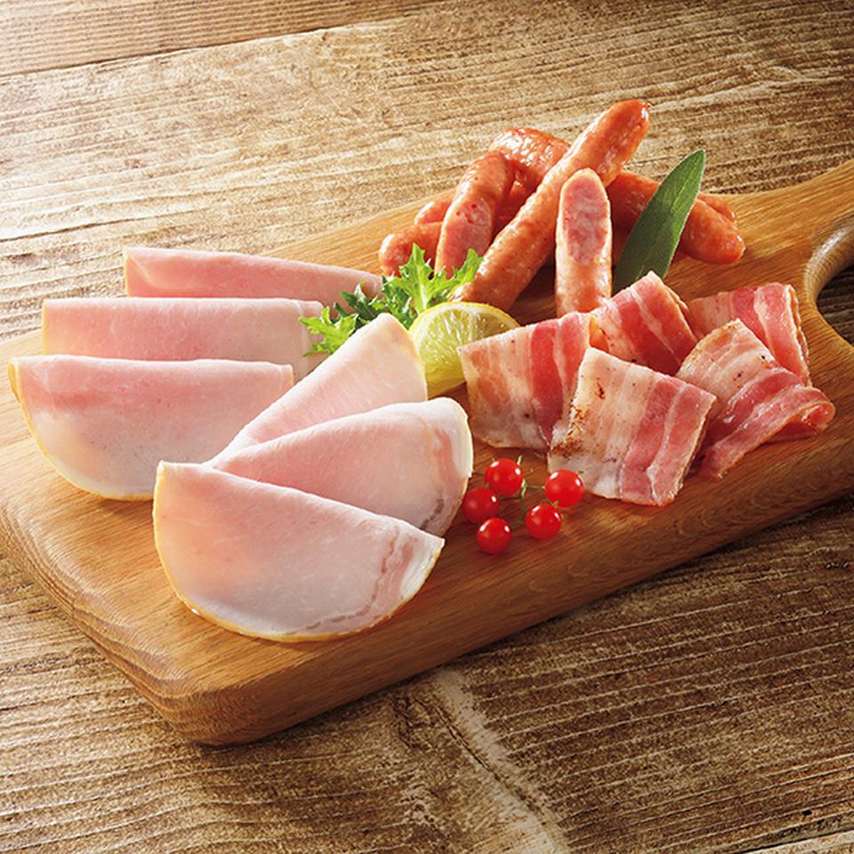 あらびきソーセージ110g×2、ロースハム70g、ももハム70g、ベーコン70g