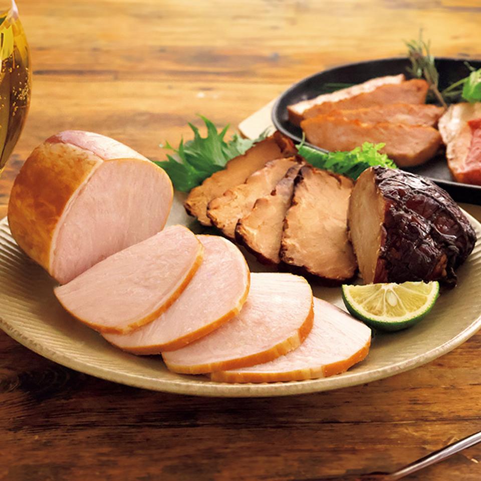 特選ロースハム320g、直火焼やきぶた170g、あらびきミートローフ160g