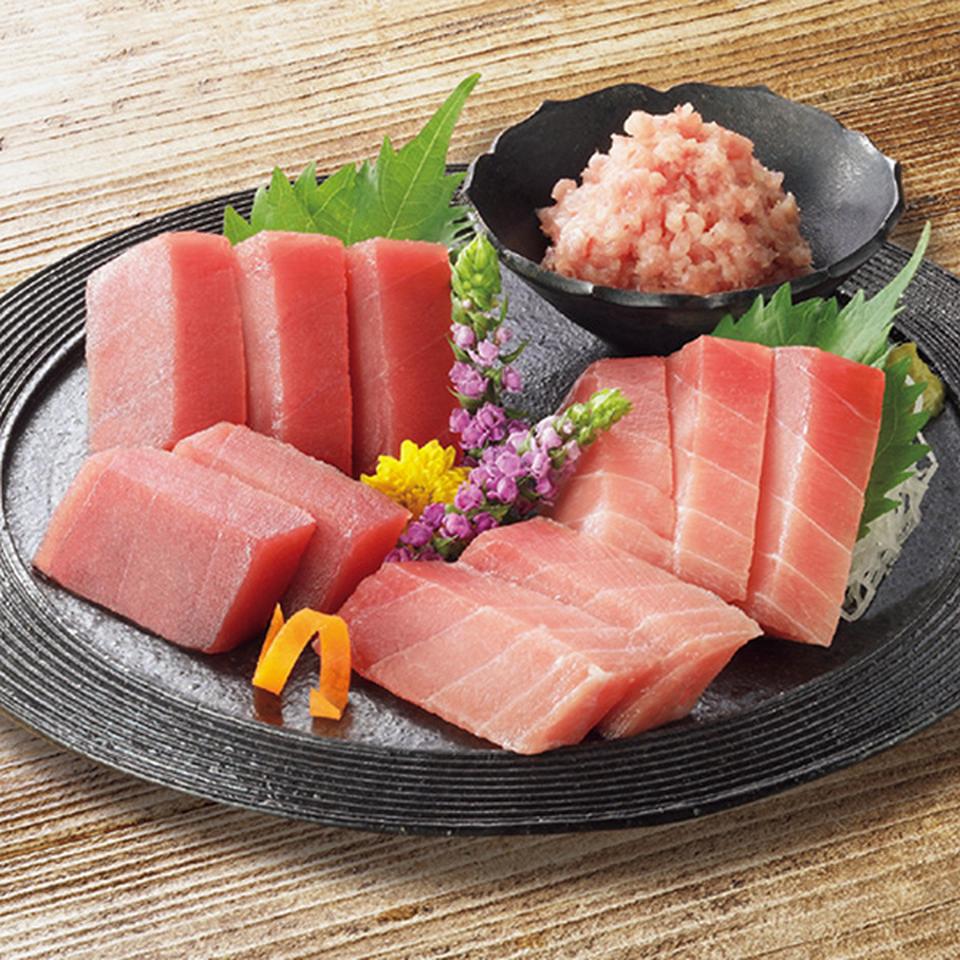 目鉢まぐろ中とろサク150g、目鉢まぐろ赤身サク150g、まぐろたたき130g(目鉢まぐろ、黄肌まぐろ、袖長まぐろ)(各原料:神奈川県・太平洋海域産)