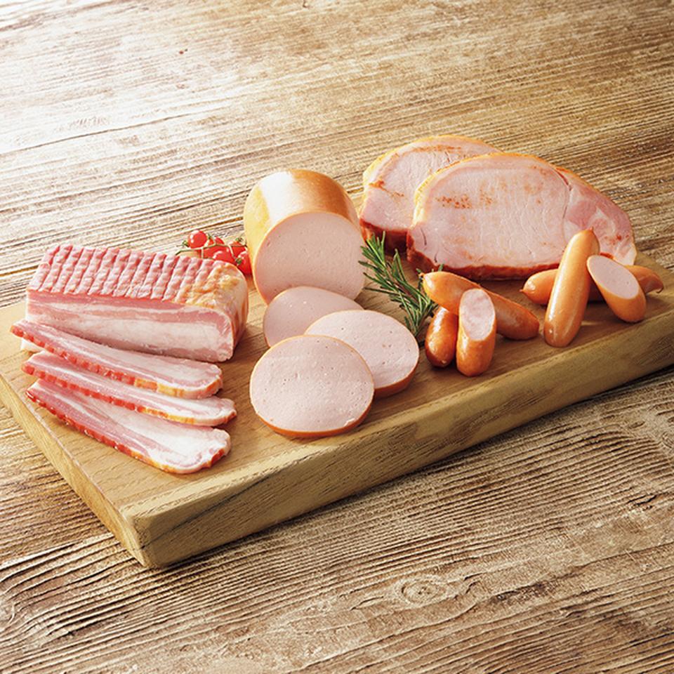 ロースハム200g、ベーコン200g、ポークソーセージ230g、ポークウインナー56g、あらびきウインナー56g