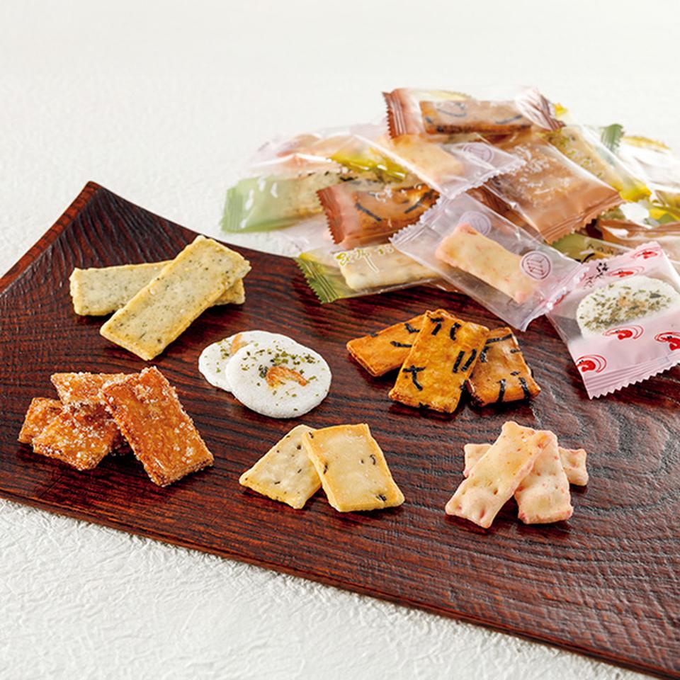 玄米サラダ、のり千枚、昆布おかき、砂糖おかき、梅えびおかき、海老せんべい 計380g(包装含む)
