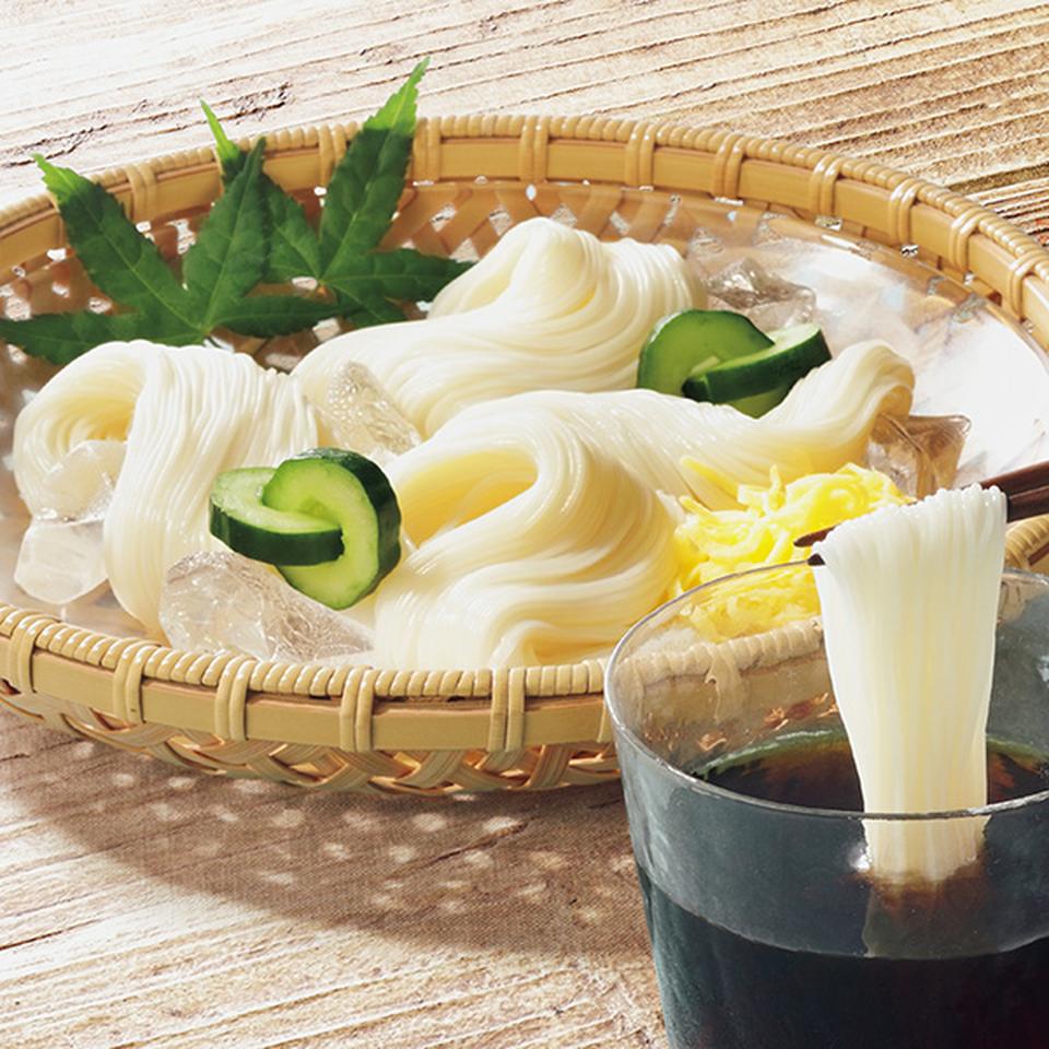 なめらかなのどごしとコシが楽しめる直径約0.6mmの極細手延べ素麺です。