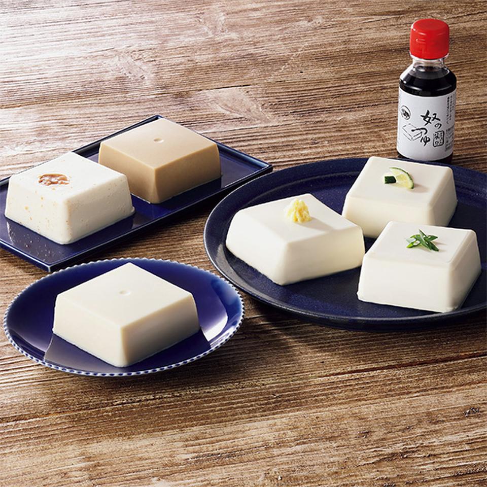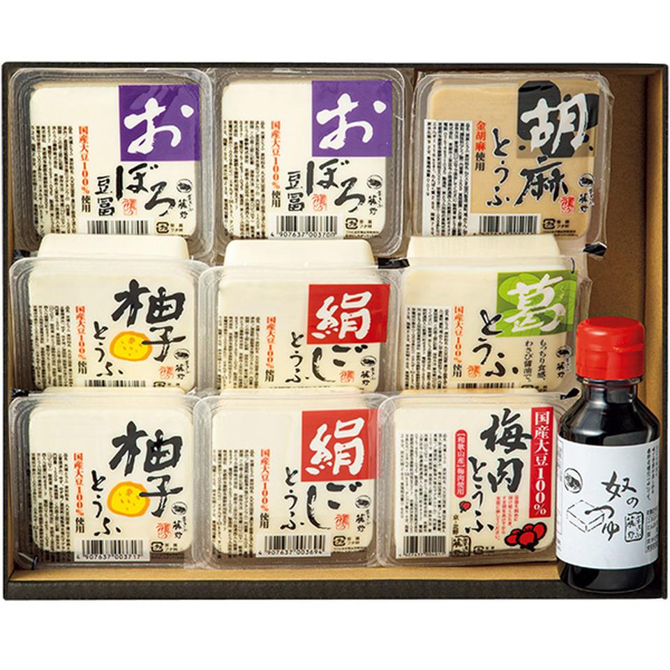 絹ごしとうふ・おぼろ豆富・柚子とうふ 各150g×2、梅肉とうふ150g、胡麻とうふ120g、葛とうふ120g、奴のつゆ100ml