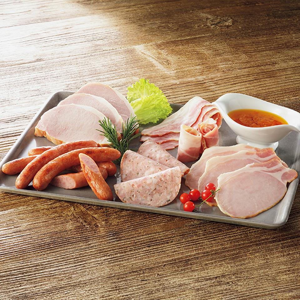 ロースハム250g、ロースハムスライス79g、ベーコンスライス80g、あらびきウインナー130g、ハーブソーセージスライス80g、ハム用ドレッシング140ml
