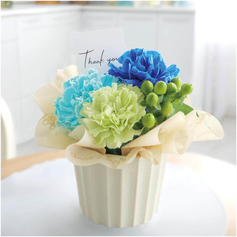 染めカーネーション(ブルー系2)、カーネーション(グリーン)、ヒペリカム、グリーン、プラスティック花器、高さ約17cm×幅約12cm、スイートポテト2、どら焼き2※染め花は人工的に染め上げておりますので、花の濃淡は個体差があります。