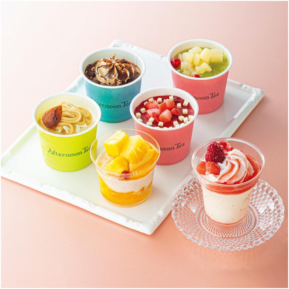 苺のパフェ80ml、スイートフルーツティーパフェ82ml、渋皮栗のモンブラン94ml、洋梨とアールグレイ・苺とチーズ・ダブルチョコレート 各103ml(計6)