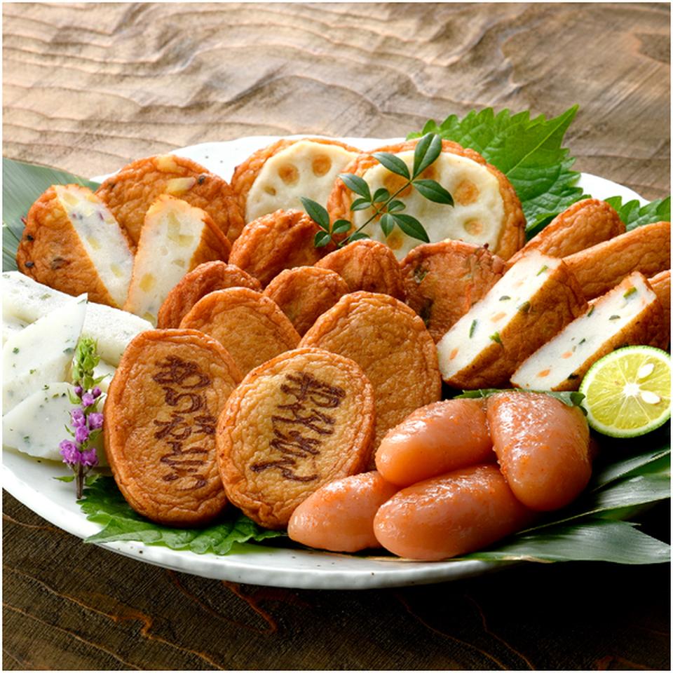 ごぼう天4、棒天3、しそ棒天3、さつまいも天2、れんこん揚2、野菜天2、上揚4(内 お父さん・ありがとう焼印 各1)、福さ屋明太子175g