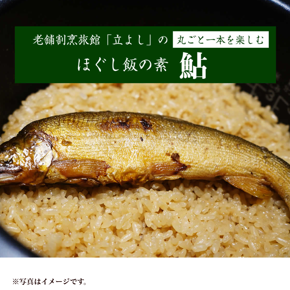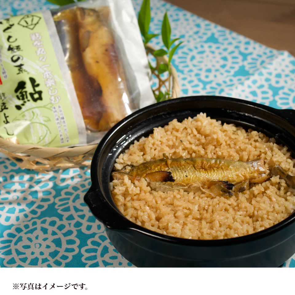 鮎を丸ごと一本使った贅沢なほぐし飯です。鮎の骨や頭などもお気になさらずほぐして混ぜて、そのままお召し上がりいただけます。