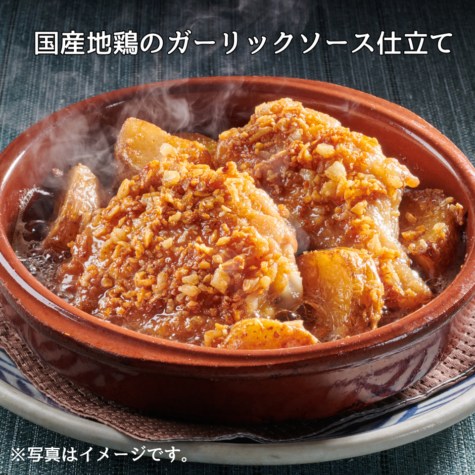ふっくらと焼き上げた国産地鶏とポテトをたっぷりのスペイン産ニンニクと合わせ、芳ばしい香りを引き出したサングリアの人気商品。