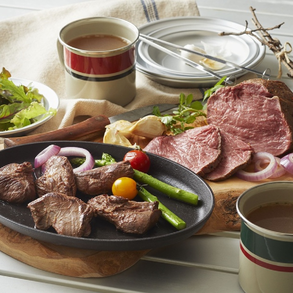 ブロック肉の使い方は自由で、ローストしても良し、角切りにして焼くも良し、また薄切りにして焼くも良し。
