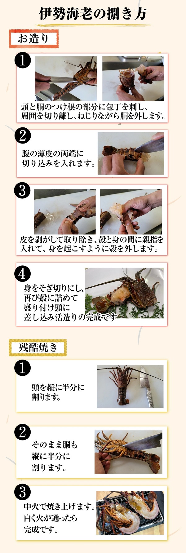 注)夏期(6~9月)のお届けについて:伊勢海老は低温度に弱いため、死着することがあります。品質上問題ございませんので安心してお召し上がり下さい。