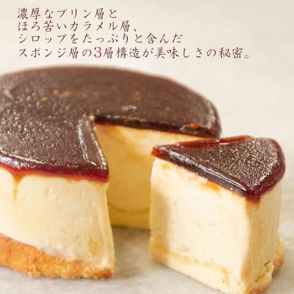 濃厚なプリン層とほろ苦いカラメル層、シロップをたっぷりと含んだスポンジ層の3層が美味しさの秘密。