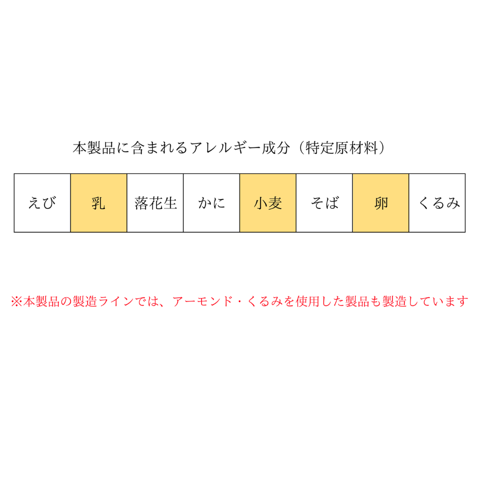 ●アレルゲン:乳・卵・小麦・くるみ・(本製品の製造ラインではアーモンドとくるみを使用した製品も製造しております。)